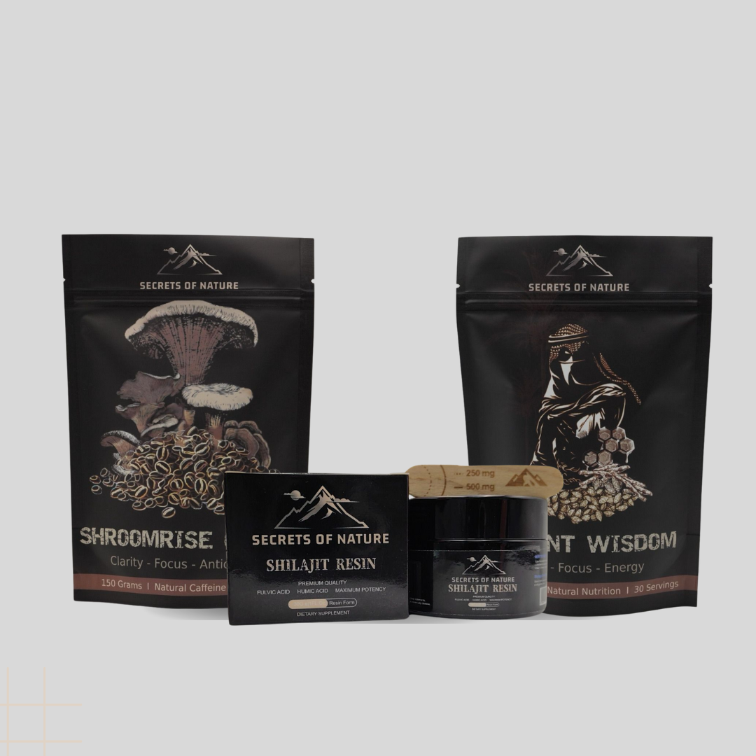 Unlock the ultimate secrets of nature with our exclusive bundle, featuring invigorating mushroom coffee, a blend of Ancient Wisdom with seven potent ingredients, and pure raw shilajit. This carefully curated combination offers a rejuvenating experience that harnesses the power of nature for your wellness journey.